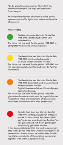 Für die erste Einordnung eines Werks hilft die sogenannte Provenienzampel. Sie zeigt den Stand der Forschung an.