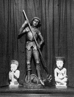 Die Skulptur des Heiligen Georgs bildet den Abschluss der nach Größe geordneten, stehenden Figuren. Sie entstand im vermutlich im 15. Jahrhundert im deutschsprachigen Raum und besteht aus Wallnussholz. Der heilige Georg, ein christlicher Märtyrer des 3. Jahrhunderts, ist vor allem durch die mittelalterliche Legende als Drachentöter bekannt. Der Sieg über den Drachen wird als Triumph des Christentums über das Böse interpretiert. Die Heiligenfigur als Ritterfigur in prächtiger Rüstung mit Lanze ist ein häufiges Motiv in der Kunst, insbesondere in Skulpturen, aber auch in Gemälden und Altarbildern.