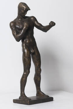 Die Figur des „Boxers Erich Brandl“ von Renée Sintenis ist im Museum in zweifacher Form zu finden: Im 1. OG befindet sich die Stukko-Figur, 1925 modelliert, und hier steht sie als Bronze, 1960 gegossen. Dies ermöglicht die Zusammenschau von Modell und Guss und lädt zum Vergleich ein. Die in Glatz in Schlesien geborene Sintenis wirkte vor allem in Berlin, wo sie von 1908 bis 1912 an der Kunstgewerbeschule studierte. Als Bildhauerin und Grafikerin schuf sie zunächst Kleinplastiken von Tieren, auch Selbstbildnisse und in den 1920er Jahren vor allem Statuetten von Sportlern. 1925 entstand die Figur des Mittelgewichtsboxers Erich Brandl, einem Newcomer im in der Weimarer Republik sehr populären Boxsport. Sintenis zeigt die Figur in dynamischer Bewegung, die Fäuste sind geballt erhoben, jederzeit bereit für den Kampf. Den durchtrainierten Körper modellierte sie genau, Muskel für Muskel. Damit rezipierte sie auch den Hype um den jungen Boxer Brandl, der nach Aktaufnahmen der Fotografin Frieda Riess zu einem Sexsymbol seiner Zeit avanciert war.