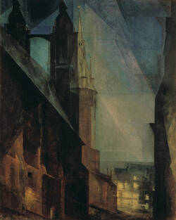 Als Lyonel Feininger 1931 die Marktkirche in Halle malte, wählte er hierfür den ungewöhnlichen Standort rechts neben dem Seitenschiff. Dunkel erheben sich der gotische Baukörper und die durch eine Brücke verbundenen Doppeltürme. Dahinter, teils durch die Türme hindurch scheinend, wird mit dem Roten Turm das Wahrzeichen von Halle sichtbar, das er vom gewählten Standpunkt aus am Markt in Wirklichkeit nicht sehen konnte. Die beiden runden Straßenlaternen rechtfertigen die Helligkeit am Kirchenschiff und stehen mit den erleuchteten Fenstern im Hintergrund in Korrespondenz. Starke, wenig gegliederte senkrechte und diagonale Linien bestimmen das Bild. Hinzu tritt Feiningers typische kristalline Wirkung der Farben. Dafür war er dazu übergegangen, die Farben meist mehrfach wieder abzuwaschen, um sie in unterschiedlicher Dichte neu aufzutragen, so dass sich die Materialität der Farbe und ihre immaterielle Leuchtkraft die Waage halten.