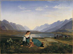 Tablo, geç Romantizm dönemine ait olup, bir anne ve çocuğun sakin bir göl kenarındaki huzurlu buluşmasını gösterir. Çocuk, elinde bir çiçek tacı tutmaktadır. Göl kenarında küçük bir grup hayvan ve çoban bulunmaktadır. Arka planda Tirol Alpleri’nin dağları yükselir. Mavi renk, eseri hakimiyeti altına almıştır. Bu sayede dinginlik ve uyum hissi uyandırır. Tıpkı huzurlu anne-çocuk sahnesinin duygusunu yansıttığı gibi. Kompozisyon, tüm çizgilerin merkeze doğru yönlendiği ve figürlerin bir sahne tarzında vurgulayan ustaca bir düzenlemeye sahiptir.