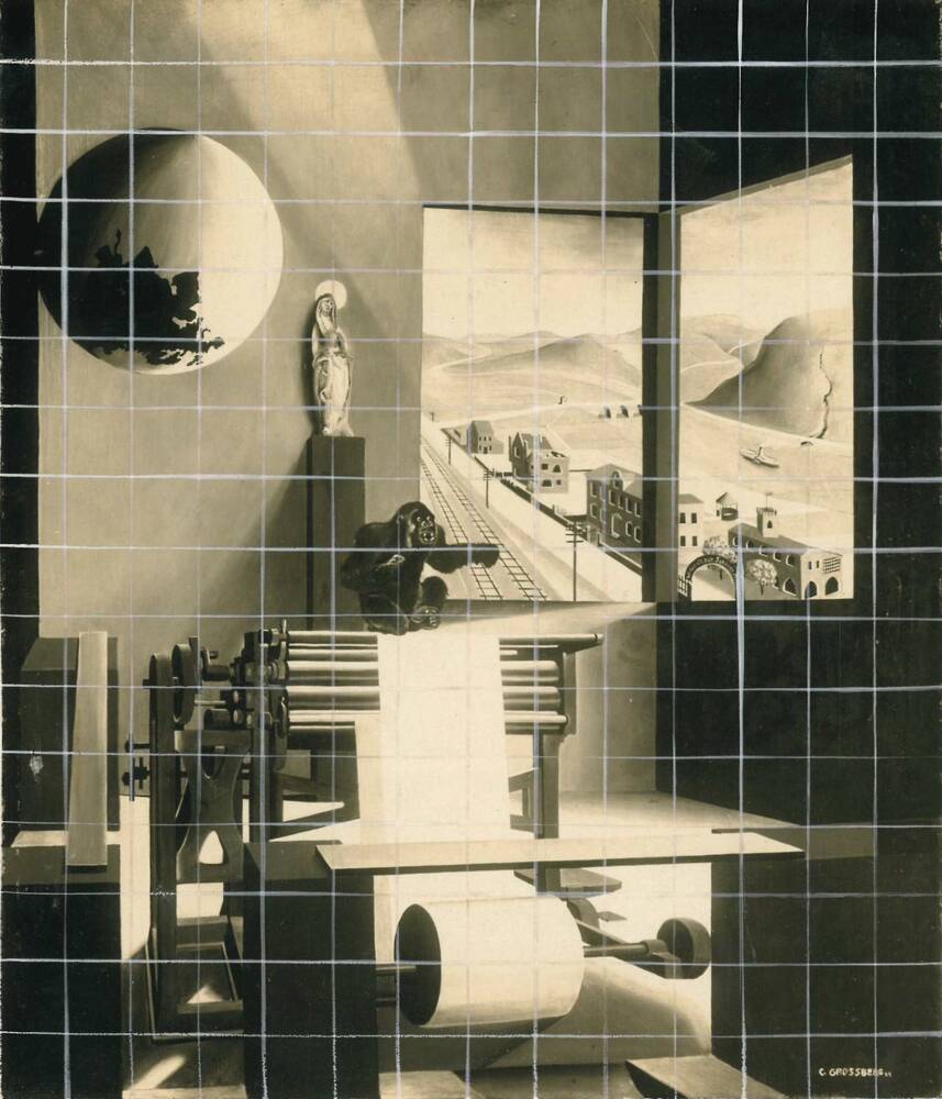 Im Vordergrund des Bildes steht eine Druckmaschine, auf der ein Gorilla sitzt. Im Hintergrund an der Wand auf einer Art Sockel befindet sich eine mittelalterliche Madonna mit Heiligenschein. Links daneben schwebt eine umgekehrte Erdkugel, auf der die Kontinente Afrika und Australien fehlen. Der Ausblick durch ein Fenster gibt den Blick auf eine bergige Flusslandschaft mit einer Eisenbahnstrecke und einer Häuserzeile frei.