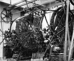 Das vorliegende Gemälde setzt monumental eine Tapetendruckmaschine ins Bild, die bei der Tapetenproduktion von NORTA zum Einsatz kam. Die Maschine steht gerade still, Papierrollen befinden sich links auf dem Boden, im Hintergrund hängen orangefarbene Tapeten zum Trocknen. Der Blickwinkel, aus dem Grossberg die Maschine dargestellt hat, zeigt, wie die Farben auf das Papier aufgebracht werden: Man sieht die Riemen, die die Papierrolle durch die Maschine bewegen, die Trommel, um die das Papier gewickelt ist, und die sechs Druckzylinder, die verschiedene Farbschichten auf das Papier geben. Das Gemälde wurde auch unter den Titeln „Tapetenfabrik“ und „Tapetenmaschine“ ausgestellt.